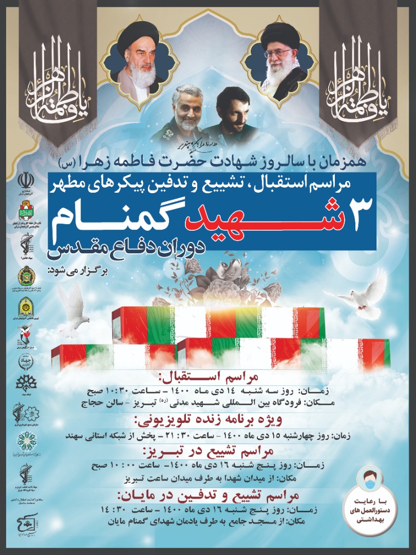 وی توضیح داد: پیکرهای مطهر این شهدای گرانقدر ساعت ۱۰ روز پنجشنبه (۱۶ دی)، با حضور مردم مومن، انقلابی، شهیدپرور و ولایی تبریز از میدان شهدا به سمت میدان ساعت تشییع و سپس به منطقه «مایان» منتقل میشوند.