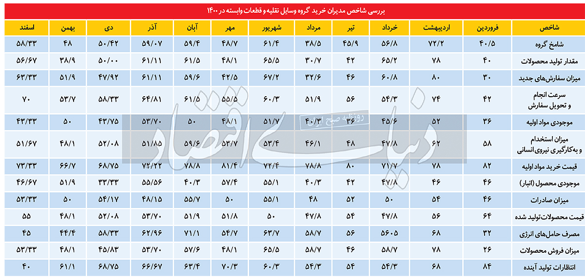 «سرعت انجام و تحویل سفارش» بهخوبی تمرکز بر تکمیل محصول ناقص را نشان میدهد. بعد از «سرعت انجام و تحویل سفارش»، آیتم «میزان سفارشهای جدید» با کسب عدد 3/ 63واحد جایگاه سوم را به خود اختصاص داده است. از آنجا که در میان مدیران خودرویی که پرسشنامه (PMI) را پر میکنند، مدیران قطعهساز هم حضور دارند، مشخص است که تکمیل خودروهای ناقص موجب افزایش سفارشگذاری خودروسازان برای قطعات شده، بنابراین آیتم «میزان سفارشهای جدید» در اسفندماه نسبت به بهمنماه حدود 11واحد رشد را به خود دیده است. «مقدار تولید محصولات» نیز با درج عدد 6/ 56واحد در اسفندماه در جایگاه چهارم جدول شاخص شامخ جای دارد. به نظر میرسد این آیتم هم تحتتاثیر نظر فعالان قطعهساز در اسفند نسبت به بهمنماه سال گذشته رشد نزدیک به 18واحدی را تجربه کرده است.