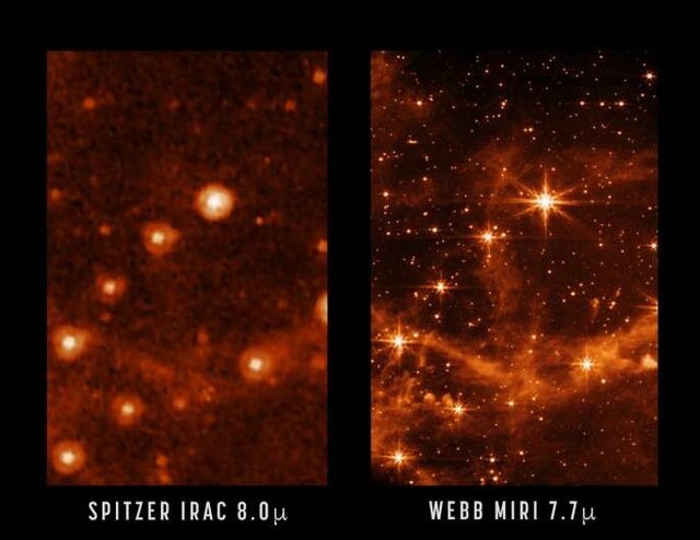 تلسکوپ فضایی "جیمز وب" به تازگی با انتشار تصویری در صفحه اینستاگرام خود به مقایسه وضوح تصاویر ثبت شدهی خود با تلکسوپ فضایی اسپیتزر(Spitzer) پرداخته است.