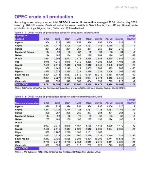 بر اساس آخرین گزارش اوپک از تولید نفت اعضای آن در ماه گذشته میلادی، تولید نفت ایران در ماه می به دو میلیون و ۵۴۴ هزار بشکه در روز رسیده است. این در حالی است که تولید نفت ایران در ۳ماهه اول سال جاری میلادی دو میلیون و ۵۲۸ هزار بشکه برآورد شده است که نشان می‌دهد تولید نفت ایران از زمان حمله روسیه به اوکراین نه‌تنها کاهش نداشته بلکه ۱۶ هزار بشکه نیز بیشتر شده است.