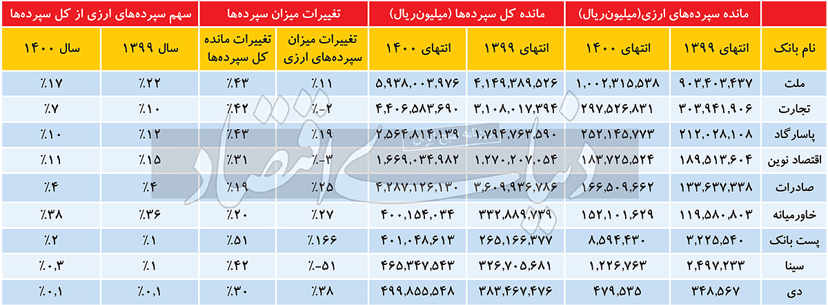 سه بانک سینا، اقتصاد نوین و تجارت به ترتیب ضعیفترین عملکرد را در جذب سپردههای ارزی داشتهاند. میزان مانده سپردههای ارزی بانک سینا نسبت به سال گذشته حدود 51 درصد کاهش داشته و از 249 میلیارد تومان به 122 میلیارد تومان رسیده است. سپردههای ارزی بانک اقتصاد نوین نیز نسبت به سال 1399 حدود 3 درصد و بانک تجارت نیز 2 درصد کاهش داشته است.