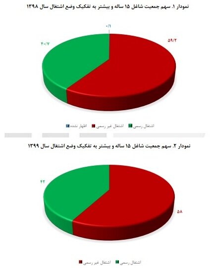 به موجب این گزارش، در سال ۱۳۹۸ سهم جمعیت شاغل کشور از اشتغال رسمی ۴۰.۷ درصد و از اشتغال غیر رسمی ۵۹.۲ درصد بوده است.