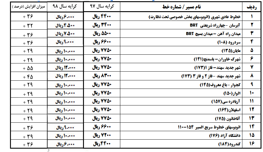 نصر: شرکت واحد اتوبوسرانی تبریز و حومه نرخ جدید خدمات حمل ونقل مسافر در سال 98 را اعلام کرد.