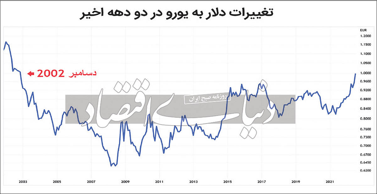 یورو در برابر دلار در ضعیفترین حالت خود از سال 2002 قرار گرفت و اروپا را با بحران جدیدی همراه کرد. روز گذشته ارزش هر یک یورو با یک دلار برابر شد. از مهمترین دلایل این برابری میتوان به واگرایی نرخ بهره توسط بانکهای مرکزی این دو منطقه اشاره کرد. فدرال رزرو، بانک مرکزی آمریکا نرخ بهره را در چند بازه زمانی افزایش داد، تحلیلگران پیشبینی کرده بودند که این سیاست ضد تورمی تا سپتامبر روند صعودی خود را ادامه خواهد داد. اما در این میان بانک مرکزی اروپا نتوانست پا به پای فدرال رزرو نرخ بهره را بالا ببرد و با ثابت نگه داشتن نرخ، سبب تضعیف یورو و برابری آن با دلار آمریکا شد. عامل دیگری که امکان دارد سبب تضعیف یورو شود، ترس اروپا از افزایش قیمت انرژی در این منطقه است، زیرا بزرگترین خط لوله انتقال گاز روسیه به اروپا در حال تعمیر است. سرمایهگذاران نگران هستند که به دلیل جنگ در اوکراین تعطیلیها ادامه یابد و در نهایت سبب محدودیت عرضه گاز در این منطقه شود که این موضوع منطقه یورو را وارد رکود میکند. در نتیجه رکود اقتصادی قاره سبز، باعث تضعیف پول رسمی اروپا خواهد شد.