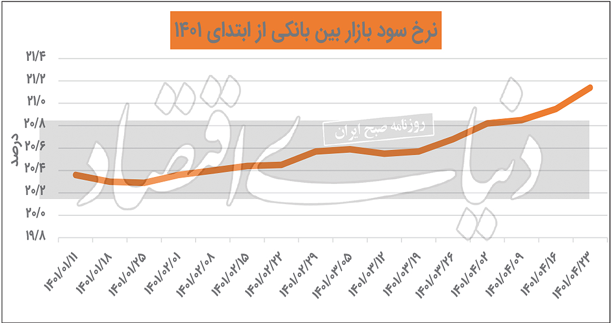 اقدام بعدی بانکمرکزی که شاید بتوان گفت که مهمترین اقدام در راستای کنترل نقدینگی بوده است، رسیدن نرخ سود سیاستی در بازار بین بانکی به بالای 20درصد است. این نرخ از چهارم آذر سال قبل به سطح 21درصدی ورود کرده بود ولی از نیمه دی ماه کاهشی شد و به سطح 20درصدی بازگشت. نرخ سود بینبانکی در 6 هفته گذشته روندی صعودی داشته است و طبق اعلام بانک مرکزی در 23 تیرماه 1401، به عدد 14/ 21درصد رسید. اتفاقی که با بررسی روند تغییرات نرخ سود در هفتههای اخیر، دور از انتظار نبود و با ثبت این رکورد به بالاترین میزان خود در 17 ماه اخیر رسید. افزایش نرخ بهره بینبانکی حکایت از آن دارد که همچنان عطش منابع مالی بسیار بالاست.