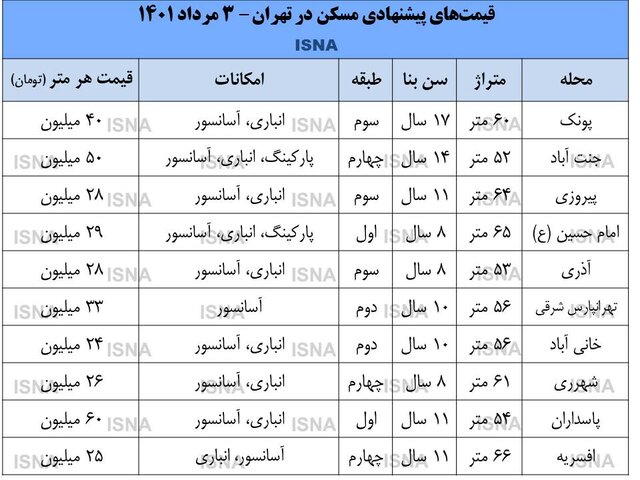 درصد تغییرات قیمت پیشنهادی هر متر مربع مسکن شهر تهران در آگهی‌های ملکی با وزن‌دهی به مناطق بر اساس تعداد معاملات قطعی حاکی از آن است که متوسط قیمت از متری ۴۰.۵ میلیون تومان در خردادماه به ۴۳.۱ میلیون تومان رسیده است.