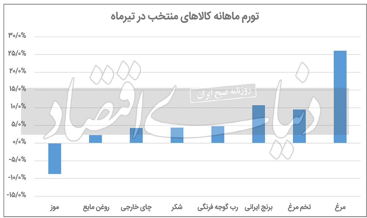 به گزارش نصر، براساس گزارش مرکز آمار ایران، در تیرماه ۱۰ کالای خوراکی رشدی بالاتر از ۱۰درصد را تجربه کردند که مرغ ماشینی با رشد ۱/ ۲۶درصد قیمت در صدر آنها قرار دارد. شواهد نشان می دهد که التهاب قیمت ها در تیرماه نسبت به ماه قبل کاهش یافته است.