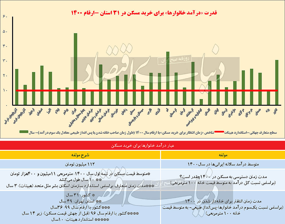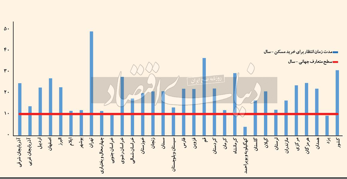 مدت زمان انتظار خانهاولیها برای خانهدار شدن در واقع براساس دورهای که هر خانوار ایرانی با محاسبه میانگین درآمد سرانه خانوار و همچنین براساس متوسط قیمت مسکن میتواند با پسانداز کردن «یک سوم» درآمد خود، اقدام به خرید مسکن کند، محاسبه شده است. دوره انتظار خانهاولیها برای خرید مسکن با پسانداز یکسوم درآمدهای خود در حالی در سال1400 نسبت به یکسال قبل از آن یعنی سال1399، معادل 5سال کاهش یافته که این میزان براساس درآمد متوسط خانوارها و میانگین قیمت مسکن هر استان در سال1400 محاسبه شده است. با توجه به اینکه هنوز آمار رسمی درخصوص تحولات قیمت مسکن کشور در یکسال1400 منتشر نشده است، متوسط قیمت مسکن براساس میانگین قیمت مسکن در نیمسال اول1400 (بهار وتابستان سال گذشته)، برآورد شده است.