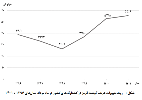 مقدار عرضه گوشت در مرداد ۱۴۰۱ نسبت به ماه مشابه سال ۱۴۰۰ برای گوسفند و بره ۱٩ درصد و گاومیش و بچهگاومیش یک درصد افزایش، و برای بز و بزغاله یک درصد، گاو و گوساله سه درصد و شتر و بچهشتر هشت درصد کاهش داشته است.