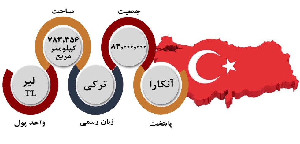 تركيه از نظر وسعت سرزميني، سی و ششمین کشور دنیا و دارای مساحتی کمتر از نصف مساحت ایران است. اين كشور با 83 میلیون نفر جمعيت، هجدهمین کشور پرجمعیت دنیا شناخته مي شود. پایتخت آن آنکارا و شهرهای استانبول، ازمیر، بورسا، آدانا، قاضی آنتپ، آنتالیا، کونیا، مرسین و ترابزون از شهرهاي مهم و مشهور آن مي باشد.