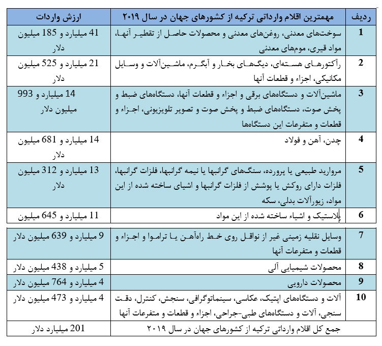 جدول1): مهمترین اقلام وارداتی ترکيه از کشورهای جهان در سال ۲۰۱۹