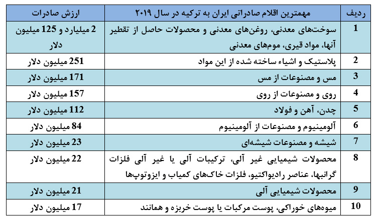 جدول 2): مهمترین اقلام صادراتی ایران به ترکيه در سال ۲۰۱۹
