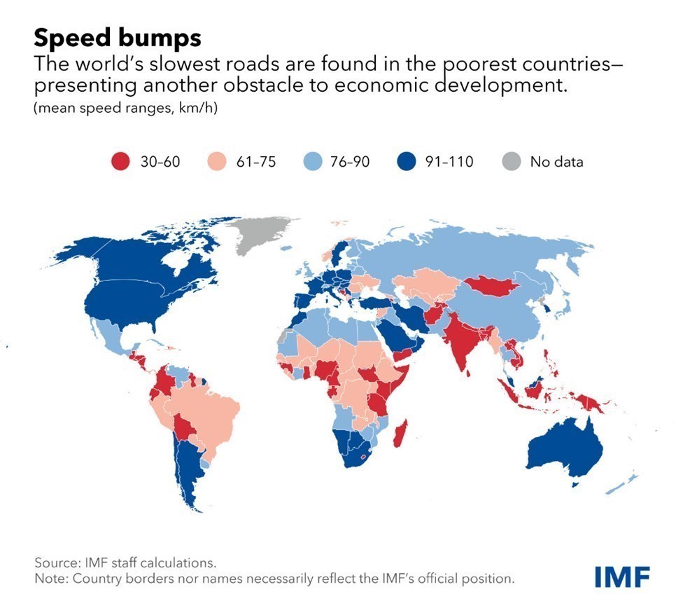 صندوق بین المللی پول در گزارش خود افزوده است: سرعت جادهها یکی از عوامل مهم در تحرک اقتصادی و توسعه یافتگی محسوب میشود. به همین دلیل، کشورهایی که جادههای کُندتری دارند، عموما کشورهای فقیر و توسعهنیافته بوده و در کشورهای ثروتمند و اقتصادهای بزرگ و توسعهیافته، عموما سرعت خودروها در جادهها بالاتر است. البته این گزارش موضوع امنیت جادهها و دیگر اشکال حمل و نقل مثل حمل و نقل ریلی و هوایی را مورد بررسی قرار نداده است.