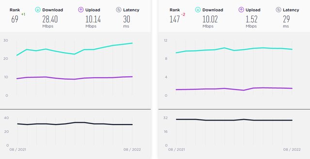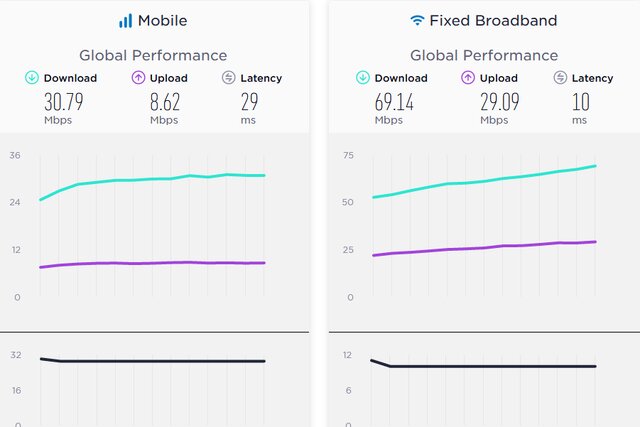 این در حالی است که در ماه جولای سال ۲۰۲۲ میانه جهانی سرعت دانلود اینترنت موبایل ۳۰.۷۸ مگابیت‌برثانیه و میانه جهانی سرعت آپلود اینترنت موبایل ۸.۵۵ مگابیت‌برثانیه و تاخیر ۲۹ میلی‌ثانیه بود. در حوزه اینترنت ثابت هم میانه جهانی سرعت دانلود، ۶۷.۲۵ مگابیت‌برثانیه و میانه جهانی سرعت آپلود ۲۸.۵۰ مگابیت‌برثانیه و تاخیر ۱۰ میلی‌ثانیه بود.