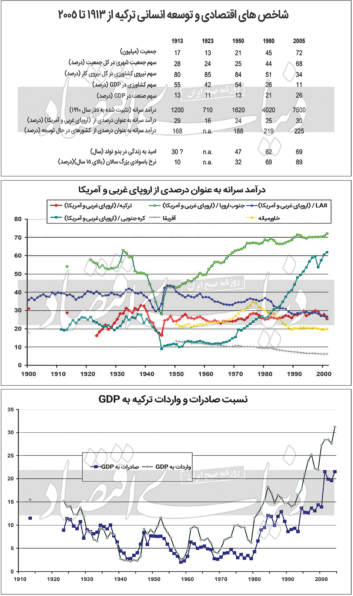 با وجود دو جنگ جهانی، درآمد سرانه در ترکیه در سال 1950 با بیش از 30درصد رشد افزایش یافته بود (1620 دلار). این معادل 24درصد از درآمد سرانه کشورهای پردرآمد و 188 درصد از درآمد سرانه کشورهای در حال توسعه بود. تا سال 2005، تولید ناخالص داخلی سرانه در ترکیه به 7500 دلار رسید، تقریبا 225درصد از سطح درآمد سرانه کشورهای در حال توسعه و 30درصد از درآمد سرانه کشورهای غربی برای همان سال. به عبارت دیگر، متوسط درآمد در ترکیه از سال 1913 تقریبا به همان میزانِ درآمد در کشورهای توسعه یافته افزایش یافته است اما ترکیه نتوانسته این شکاف بزرگ را برطرف کند. در عین حال، افزایش متوسط درآمد در ترکیه از سال 1913 کمی سریعتر از کشورهای در حال توسعه بوده است. نمودار نشان میدهد با اینکه از 1913 عملکرد ترکیه در رکورد رشد تولید ناخالص داخلی سرانه از میانگینهای آفریقا، خاورمیانه و آمریکای لاتین بهتر بوده اما از سال 1950 این کشور به طور قابل توجهی از جنوب اروپا و شرق آسیا عقب مانده است. از طرف دیگر، از سالهای 1913 و 1950، سطح تحصیلات در ترکیه که با سواد، سالهای تحصیل و همین طور ثبتنام مدارس سنجیده میشود با اختلاف بزرگ از سطح تحصیلات در کشورهای در حال توسعه با سطوح مشابه تولید ناخالص داخلی عقبتر بوده است.