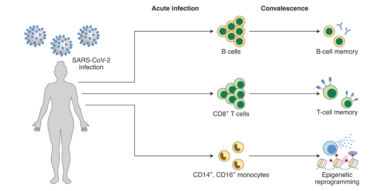 عفونت کووید-19 منجر به تکثیر سلولهای T میشود که به دنبال آن، بقای چند سلول تیِ حافظهای، ایمنی و محافظت طولانیمدت پس از حذف ویروس را تضمین میکند. این روند بهبود عفونت، باعث ایجاد تغییراتی در واکنشهای ایمنی ذاتی پس از کووید-19 میشود. عکس از: nature