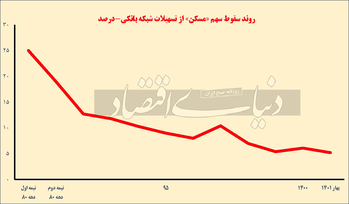 همچنین در سال 1400 مجموع شبکه بانکی 9/ 6درصد از تسهیلات پرداختی خود را به بخش مسکن اختصاص داده بود که این میزان در برش فصل بهار 1401 قدری تنزل کرده و به 2/ 5درصد رسیده است. البته نیمه سال گذشته نیز سقف وام مسکن به دوبرابر افزایش پیدا کرد اما با این حال در گزارش عملکرد این سال سهم بخش مسکن از تسهیلات بانکی دو برابر نشد و فقط با افزایش 5/ 1 واحددرصدی به 9/ 6درصد رسید.