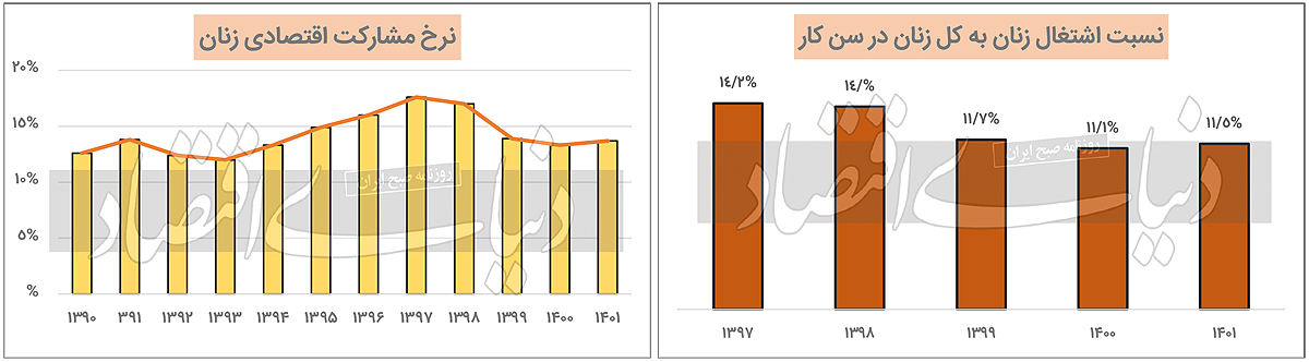 در واقع همانگونه که مشارکت اقتصادی در سال 1399 با کاهش مواجه شد، نسبت فعالیت اقتصادی زنان به کل فعالیتهای اقتصادی نیز کاهش یافت. اما نکته قابلتوجه این است که پس از واکسیناسیون سراسری و عبور از بحران در سال 1400، مشارکت اقتصادی به صورت کلی و مشارکت اقتصادی مردان افزایش یافت، اما این مساله در مورد مشارکت اقتصادی زنان صادق نبود و سیر نزولی نسبت فعالیت اقتصادی زنان ادامه داشت و در پایان سال 1400 به 3/ 13درصد رسید. آخرین آمار مربوط به فعالیت اقتصادی زنان در 6 ماه ابتدایی سال 1401 بیانگر این است که فعالیت اقتصادی زنان معادل 7/ 13درصد بوده است. دلیل این مساله و کاهش فعالیت اقتصادی زنان را میتوان در نابسامانی و از میان رفتن بسیاری از کسبوکارهای خرد بررسی کرد. به عبارتی میتوان گفت زنانی که به کسبوکارهای خرد و خانگی اشتغال داشتند، نتوانستند پس از عبور از بحران کرونا، فعالیتهای اقتصادی خود را بازیابی کنند.