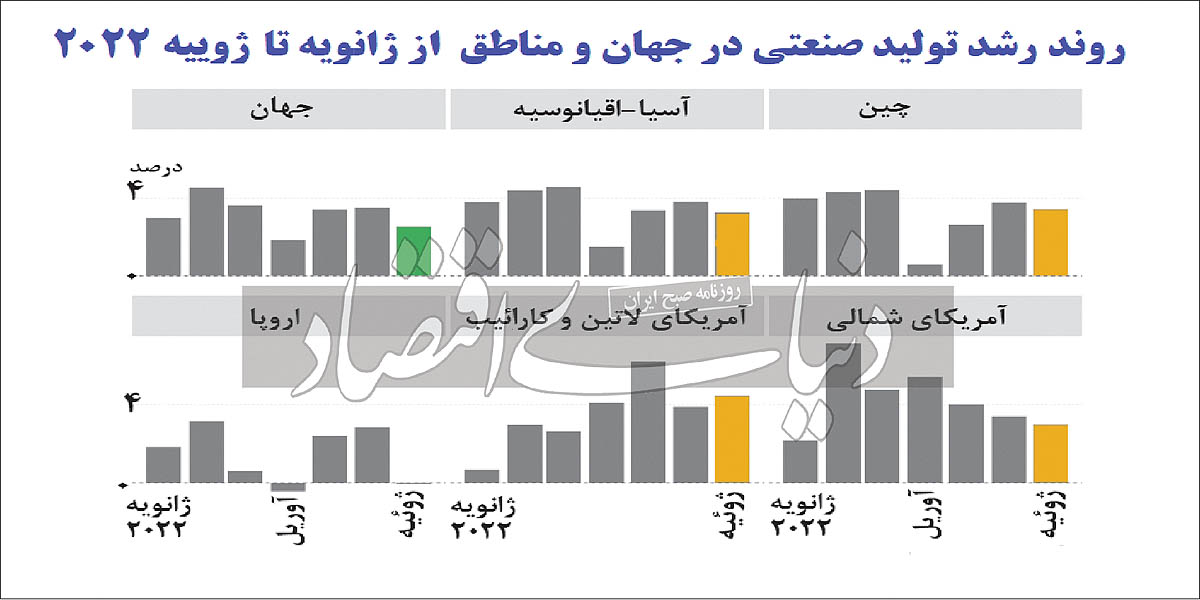 در گزارش به نرخ رشد سالانه تولید منطقه‌‌‌ای صنایع در جهان در ماه‌‌‌های اخیر اشاره شده است. وضعیت در ژوئیه اما اهمیت بیشتری دارد. در ژوئیه 2022، آسیا و اقیانوسیه رشد تولید 2/ 3درصدی را ثبت کردند. کاهش جزئی در عملکرد، منعکس‌کننده توسعه تولید در اقتصادهای بزرگ منطقه است. در واقع در شرق آسیا بخش صنعت چین با 4/ 3درصد، بخش صنعت کره‌جنوبی با 3‌درصد و بخش صنعت هند با 3/ 3‌درصد نرخ رشد بهترین عملکرد را به ثبت رسانده‌‌‌اند. در عین حال ژاپن در این ماه انقباض دیگری را ثبت کرده است تا اختلال بخش صنعت این کشور تداوم پیدا کند. البته پیش‌بینی یونیدو درباره رشد تولید صنعتی ژاپن صعودی است؛ این یعنی چشم‌انداز صنایع در حال بهبود است. مهم‌ترین نشانه آن هم رشد تولید وسایل نقلیه موتوری به‌عنوان یکی از بزرگ‌ترین صنایع ژاپن است که قدرت بیشتری را به بخش صنایع این کشور می‌‌‌بخشد.