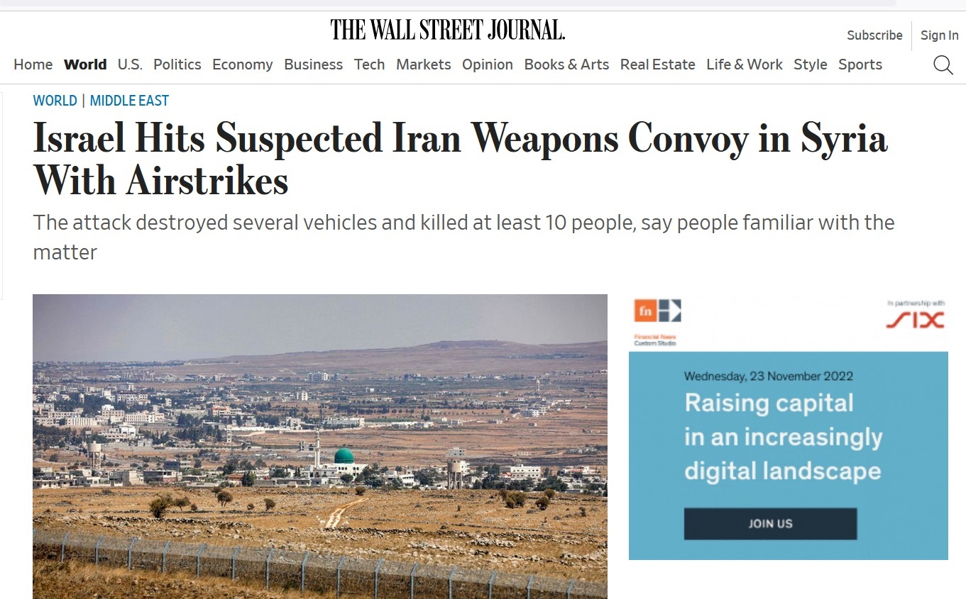 نصر: روزنامه امریکایی وال استریت ژورنال به نقل از منابع آگاه نوشت حمله هوایی به کاروان خودروهای حامل سوخت ایران در مرز سوریه و عراق، کار ارتش اسرائیل بود.