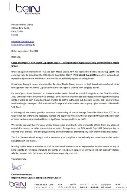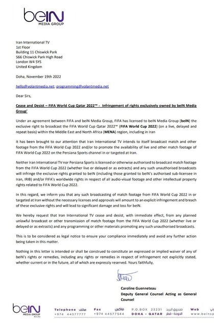 در بخشی از این نامه که به شبکه اینترنشنال و پرشیانا به صورت جداگانه فرستاده شده، آمده است: «بر اساس توافقنامه بین فیفا و شرکت beIN Media Group، فیفا به گروه رسانهای beIN مجوز حق انحصاری پخش جام جهانی FIFA۲۰۲۲ قطر ـ جام جهانی فوتبال۲۰۲۲ ـ (به صورت زنده، با تاخیر و با تکرار) را در منطقه خاورمیانه و شمال آفریقا (MENA ) از جمله ایران را داده است. بر این اساس هرگونه پخش فیلمهای بازی جام جهانی ۲۰۲۲ برای ایرانیان در کشور ایران با صداوسیما بوده و نقض این حقوق انحصاری است و خسارت و زیان قابل توجهی را برای beIN به دنبال خواهد داشت. این به عنوان اطلاعیه قانونی برای اطمینان از رعایت فوری شما و جلوگیری از هرگونه اقدام بعدی در این مورد تلقی میشود. هیچ چیز در این نامه به معنای چشمپوشی صریح یا ضمنی از حقوق یا راهحلهای جبران خسارت beIN نیست؛ از جمله هرگونه حقوق یا راه حلی در رابطه با نقض که صریحا هم بیان نشده است، چه در حال حاضر و چه در آینده، که همه آنها به صراحت بیان شده اند.»