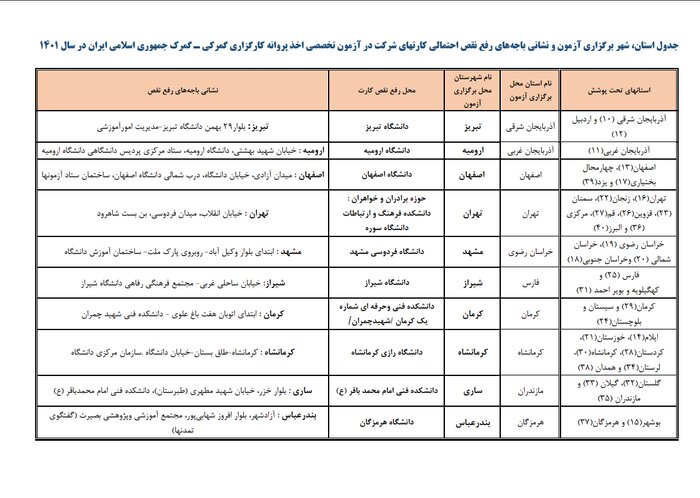 همچنین سازمان سنجش آموزش کشور در اطلاعیه دیگری اعلام کرد:‌ آزمون تخصصی اخذ پروانه کارگزاری گمرکی ـ گمرک جمهوری اسلامی ایران در سال ۱۴۰۱ صبح جمعه ۱۱ آذرماه در ۱۰ شهرستان کشور (مراکز استان) به شرح جدول اعلام شده برگزار می‌شود.