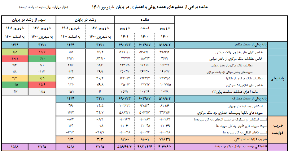 نرخ رشد نقدینگی در ۱۲ ماه منتهی به شهریور ماه ۱۴۰۱ نسبت به سال قبل از آن ۳۷.۵ درصد و در شهریور ماه ۱۴۰۱ نسبت به اسفند ۱۴۰۰ نیز ۱۵.۸ درصد رشد داشت؛ این در حالی است که نرخ رشد نقدینگی در ۱۲ ماه منتهی به شهریور سال گذشته ۴۰.۵ درصد بوده است که حکایت از کاهش آهنگ رشد نقدینگی دارد.