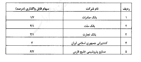 بر این اساس؛ وزارت امور اقتصادی و دارایی مکلف است در مرحله اول از محل باقیمانده سهام متعلق به دولت در بنگاههای قابل واگذاری به شرح جدول زیر نسبت به واگذاری مستقیم سهام به افراد فاقد سهام عدالت تحت پوشش کمیته امداد امام خمینی و سازمان بهزیستی و سه دهه اول ایثارگران اقدام نماید: