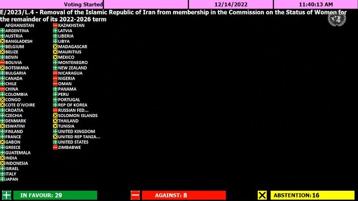 کشورهای بولیوی، چین، قزاقستان، نیکاراگوئه، نیجریه، عمان، روسیه و زیمبابوه به قطعنامه پیشنهادی برای حذف ایران از کمیسیون مقام زن سازمان ملل رأی مخالف دادند.