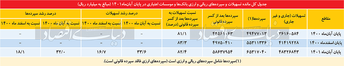 نصر: مانده کل سپرده‌‌‌ها در پایان آبان ماه سال ۱۴۰۱، بالغ بر ۶۵۳۱۷‌هزار میلیارد ریال شده است که نسبت به مقطع مشابه سال قبل ۱۵۸۴۰‌هزار میلیارد ریال (۳۲‌درصد) و نسبت به پایان سال قبل معادل ۷/ ۱۰۰۰۵‌هزار میلیارد ریال (۱/ ۱۸درصد) افزایش نشان می‌دهد.