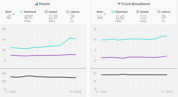 میانگین سرعت دانلود اینترنت سیار بر اساس این شاخص، ۵۴.۹۳ مگابیت بر ثانیه، سرعت آپلود ۱۴.۴۶ مگابیت بر ثانیه و میزان تأخیر ۳۳ میلی‌ثانیه است. در اینترنت ثابت، سرعت دانلود ۲۴.۶۱ مگابیت بر ثانیه، سرعت آپلود ۱۴.۲۳ مگابیت بر ثانیه و میزان تأخیر ۴۰ میلی‌ثانیه است.