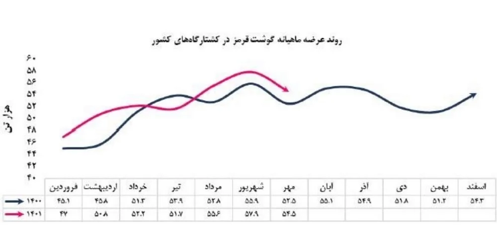 بر اساس نمودار (۱) تولید گوشت قرمز در ماههای سال ۱۴۰۱ در مقایسه با سال ۱۴۰۰(بهاستثنای تیرماه)، بیشتر بوده است.