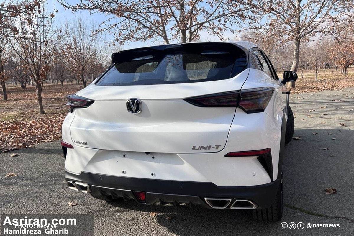 چانگان یونی تی UNI-T در نمای عقب نیز طراحی مناسبی دارد. چهار خروجی واقعی اگزوز با سراگزوزهای ذوزنقه شکل داخل دیفیوزر سپر این خودرو قرار گرفته اند. چراغ.های اصلی عقب به صورت باریک و کشیده طراحی شده و گرافیک داخلیشان نیز به رنگ مشکی است. شاید جالبترین نکته در طراحی عقب چانگان یونی تی UNI-T را بتوان اسپویلر عقب این خودرو دانست که حالتی V شکل در قسمت میانی داشته و به صورت دو تکه طراحی شده که تا قسمت کناری شیشه ها نیز امتداد یافته است.