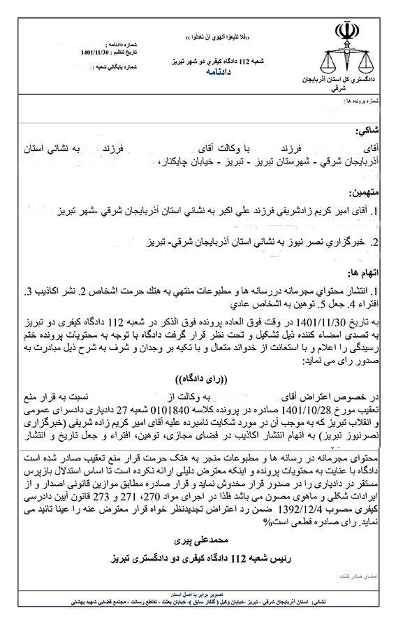اما شاکی پرونده به این رای اعتراض کرد تا بلکه بتواند در دادگاه اقدام خود که موجب آزار و اذیت اهالی منطقه شده است؛ را خلاف واقع جلوه کند اما رئیس شعبه 112 دادگاه کیفری دو دادگستری آذربایجان شرقی نیز بعد از احضار مدیر مسئول نصر و استماع دفاعیات وی رای بازپرس پرونده را تایید و قرار تبرئه و منع تعقیب را صادر کرد.