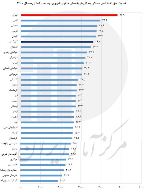 در بین استان‌های کشور، تهران، البرز و همدان به ترتیب با ۴۷.۹ درصد، ۳۹.۴ درصد و ۳۷.۹ درصد بالاترین میزان هزینه خالص مسکن در سبد خانوار را به خود اختصاص می‌دهند. در سوی مقابل، کهگیلویه و بویراحمد با ۱۸.۶ درصد کمترین میزان هزینه مسکن را در بین استان‌های کشور دارد. پس از آن خراسان جنوبی با ۲۰.۷ درصد و چهارمحال و بختیاری با ۲۱.۷ درصد کمترین هزینه مسکن را دارا هستند.