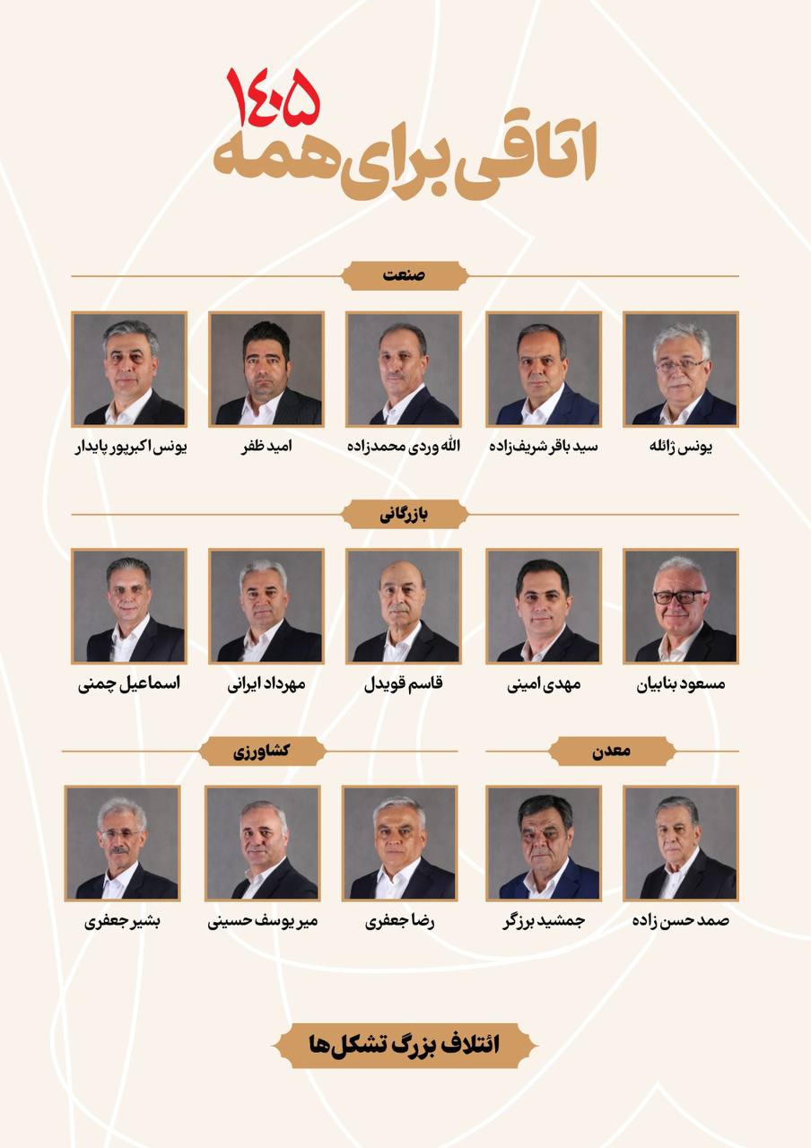 ائتلاف اتاقی برای همه 1405 ترکیبی از 15 عضو این اتاق است که هر کدام در حوزه فعالیت خود از صاحبان برندهای خوشنام و تاثیرگذار منطقه هستند و قرار است با انتخاب اکثریت شان زمینه فعالیت های گسترده در حوزه های مختلف اقتصادی منطقه را رقم زنند.
