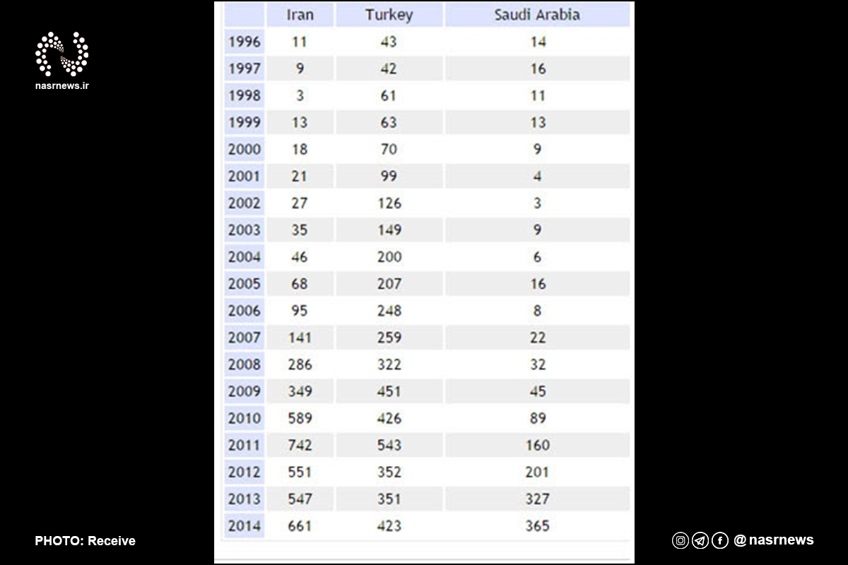 در جدول زیر تولیدات علمی ایران در مقایسه با رقبای منطقهای تا سال ۲۰۱۴ آمده است: