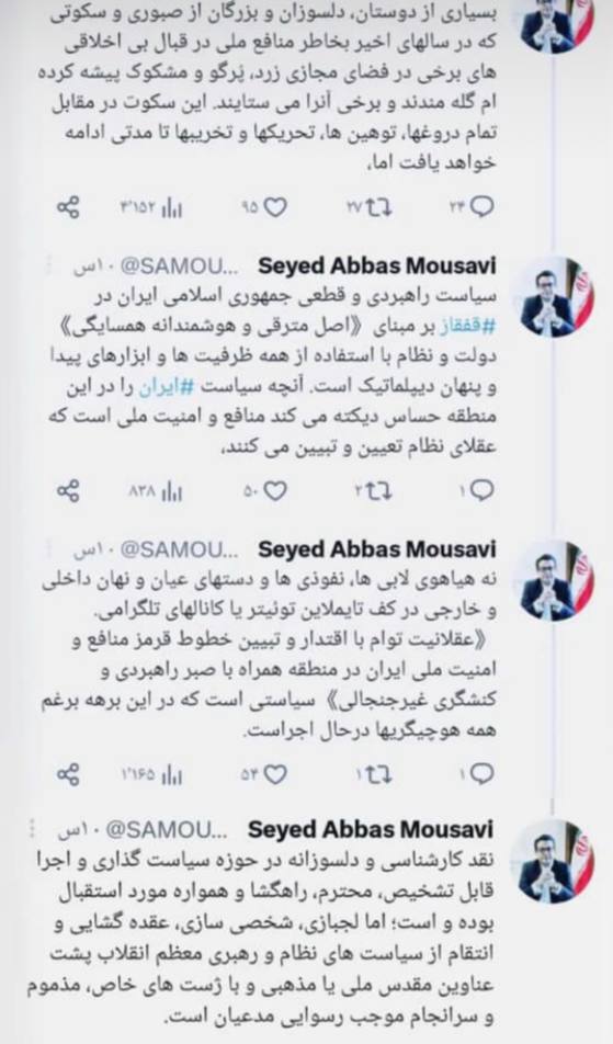 به گزارش نصر، سید عباس موسوی، سفیر جمهوری اسلامی ایران در جمهوری آذربایجان امروز با انتشار رشته توئیت‌هایی در توئیتر خود در واکنش به برخی تلاش‌ها برای متشنج کردن مناسبات ایران با جمهوری آذربایجان، نوشت: «بسیاری از دوستان، دلسوزان و بزرگان از صبوری و سکوتی که در سال‌های اخیر به خاطر منافع ملی در قبال بی‌اخلاقی‌های برخی در فضای مجازی زرد، پُرگو و مشکوک پیشه کرده‌ام گله‌مندند و برخی آن را می‌ستایند. این سکوت در مقابل تمام دروغ‌ها، توهین‌ها، تحریک‌ها و تخریب‌ها تا مدتی ادامه خواهد یافت، اما سیاست راهبردی و قطعی جمهوری اسلامی ایران در قفقاز بر مبنای «اصل مترقی و هوشمندانه همسایگی» دولت و نظام با استفاده از همه ظرفیت‌ها و ابزار‌های پیدا و پنهان دیپلماتیک است».