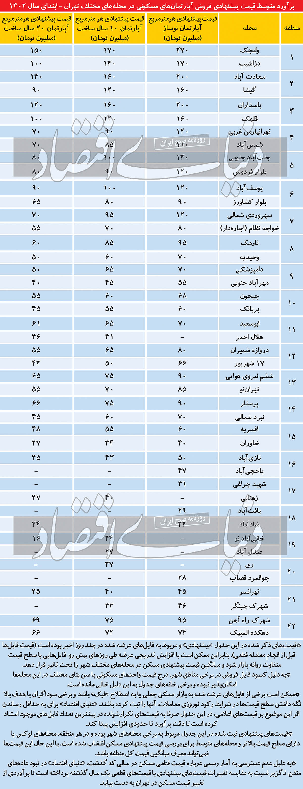 در این فضای تاریک که دمای معاملات و قیمت مسکن نامعلوم است، «دنیایاقتصاد» با سنجش تغییرات قیمت فایلها برآوردی از میانگین قیمت مسکن در شهر تهران را محاسبه کرده است که میتواند به منزله تاباندن اندک نوری به وضعیت حال حاضر بازار نقل و انتقالات ملکی باشد. هرچند میانگین قیمتهای پیشنهادی فایلهای موجود در بازار مسکن نمیتواند نماینده کامل تغییرات تورم ملکی در کل شهر تهران باشد و برای برداشت دقیق از وضعیت بازار مسکن لازم است به جای قیمتهای پیشنهادی، به قیمتهای قطعی در معاملات استناد شود، اما به استناد دادههای موجود از سطح قیمتهای پیشنهادی مسکن در محلههای مختلف، میانگین قیمت هر مترمربع آپارتمان مسکونی در شهر تهران در حال حاضر مبتنی بر قیمتهای پیشنهادی فروش، به حول و حوش 70 میلیون تومان رسیده است. این در حالی است که بر اساس آخرین آمار رسمی منتشر شده از سوی مرکز آمار در دی ماه این رقم مبتنی بر قراردادهای قطعی 53 میلیون تومان بود.
