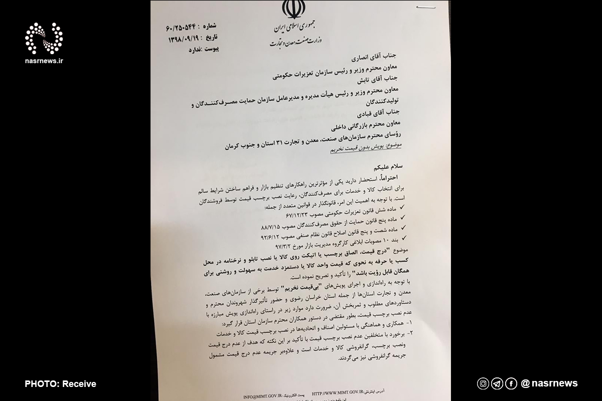 به گزارش نصر به نقل از فارس، قائم مقام وزیر صنعت با ارسال نامهای به سازمانهای ناظر بر بازار جهت راهاندازی پویش «بدون قیمت نخرید»، اعلام کرد: هدف از عدم درج برچسب قیمت، گرانفروشی است و باید به شدت با آن برخورد شود.