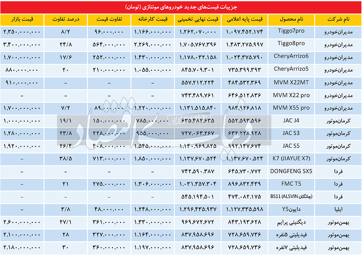همانطور که اشاره شد شورای رقابت برای 17 خودروی مونتاژی دست به قیمتگذاری زده که سهم مدیران خودرو از این لیست هفت خودرو است. تیگو 7 پرو یکی از این محصولات است که قیمت پایه آن با تصمیم شورای رقابت به یکمیلیارد و 97میلیون تومان رسیده که با فرض 15درصد هزینههای اضافی، قیمت آن میتواند به یکمیلیارد و 262میلیون تومان برسد. این در صورتی است که قیمت این خودرو در کارخانه پیش از این قیمتگذاری حدود یکمیلیارد و 166میلیون تومان بود؛ بنابراین این خودرو جزو معدود مواردی است که میتوان انتظار داشت در صورت اضافه شدن 15درصد هزینههای جانبی قیمت آن هشت درصد بیشتر از قیمت پیشین آن باشد. قیمت این خودرو در بازار دومیلیارد و 350میلیون تومان است. محصول دیگر مدیرانخودرو یعنی تیگو 8 پرو اما افت قیمت قابلتوجه 564میلیونی قیمت نهایی تخمینی نسبت به قیمت قبلی دارد. این خودرو در لیست منتشرشده یکمیلیارد و 483میلیون تومان قیمتگذاری شده که قیمت نهایی تخمینی آن میتواند به یکمیلیارد و 705میلیون تومان برسد. قیمت این محصول در بازار سهمیلیارد و 400میلیون تومان است.