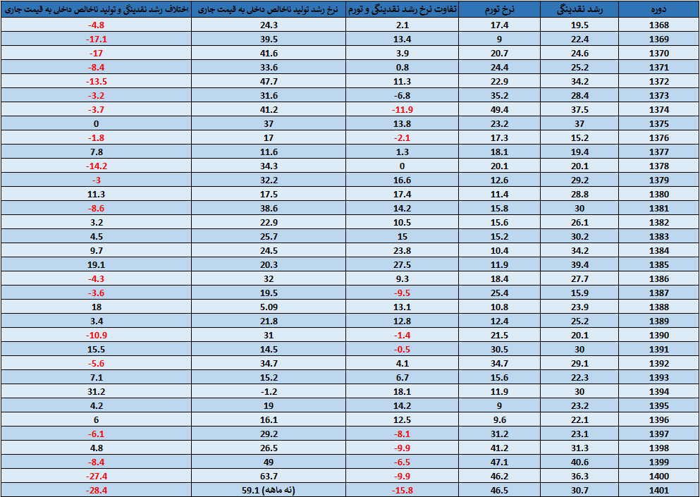 در جدول تهیه شده، اطلاعات و آمار رشد نقدینگی، نرخ تورم و رشد تولید ناخالص داخلی به قیمت جاری از سال 1368 تا 9 ماهه 1401 درج شده است. در سال 1368 نرخ رشد نقدینگی معادل 19.5 درصد بوده است اما رشد تولید ناخالص داخلی به قیمت جاری به 24.3 درصد رسیده است. بنابراین رشد واقعی نقدینگی در این سال منفی 4.8 درصد بوده است. همین نسبت در سال های 69 تا 37 به ترتیب منفی 17.1 درصد، منفی 17 درصد، منفی 8.4 درصد، منفی 13.5 درصد، منفی 3.2 درصد، منفی 3.7 درصد، صفر درصد و منفی 1.8 درصد بوده است.