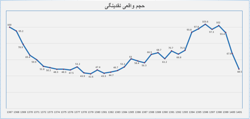 اما از سال 1397، روند معکوس می شود به طوری که نرخ رشد واقعی نقدینگی به غیر از سال 98 همواره روند نزولی داشته است. در سال 97 نرخ واقعی نقدینگی منفی 6.1 درصد بوده و در سال 98 به مثبت 4.8 درصد می رسد اما در سال های 99 تا 1401 به ترتیب منفی 8.4 درصد، منفی 27.4 درصد و منفی 28.4 درصد می شود. سال 1401 رکوردار رشد منفی حجم واقعی نقدینگی است زیرا از سال 1368 تا 1400 هیچگاه نرخ رشد واقعی نقدینگی این میزان منفی نشده است.