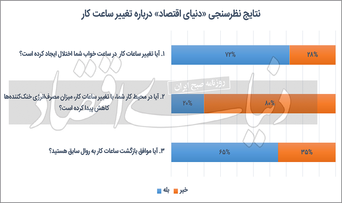 به گزارش نصر، نتایج نظرسنجی «دنیای اقتصاد» در اینباره نشان میدهد «شروع غیرعادی ساعتکار (از ۶ صبح)» باعث اختلال خواب شهروندان شده و اثری در صرفهجویی انرژی در محل کار نداشته است. به دنبال عدم تغییر ساعت رسمی کشور در سال جاری، دولت، ساعت کار کارمندان را به ۶صبح منتقل کرد. هرچند که قرار بود بهدلیل مشکلات ایجادشده بر اثر این تغییر شروع ساعتکار، ساعت کاری مجددا به روال قبل (عادی) بازگردد، اما آنچه در حال حاضر برای کارکنان و کارمندان دستگاههای مختلف جاری و برقرار است به این صورت است که کارکنان برخی از شرکتهای دولتی بهدلیل اضافهکاری تا ساعت ۴بعدازظهر در محل کار حضور دارند و برخی هم کماکان مجبور هستند «کار را از همان ۶ صبح که بخش پایانی ساعت خواب است، شروع کنند.» در نظرسنجی «دنیایاقتصاد» اکثر شهروندان خواستار بازگشت ساعت کار به رویه گذشته شدند. حال باید دید با توجه به نتایج منفی، سیاستگذار از «ساعت دستوری» عقبنشینی میکند؟