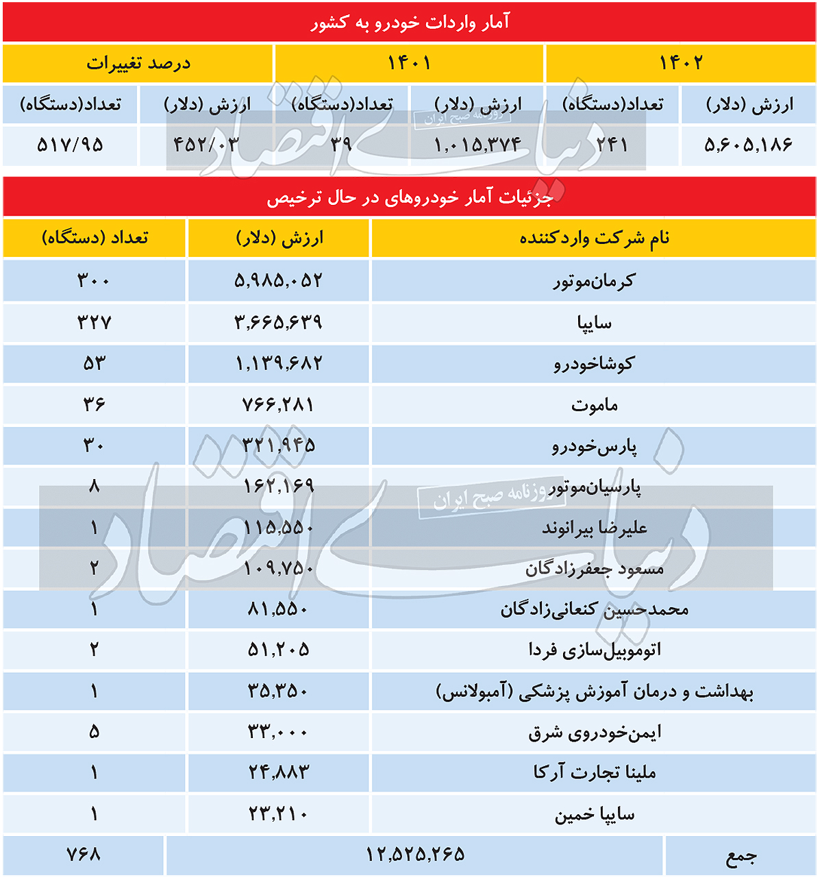 اما در بازه زمانی ابتدای بهمنماه سال ۱۴۰۱ تا ۳۱ خردادماه سال ۱۴۰۲، تعداد ۲۴۶ دستگاه خودرو وارد کشور شده که در این بین، عمده خودروهای سواری واردشده توسط «پارس خودرو» به تعداد ۹۰ دستگاه و ارزش ۹۶۶هزار دلار بوده است. بنابراین سهم پارسخودرو از واردات بهار امسال بالغ بر 96/ 17درصد از ارزش و 59/ 36درصد از تعداد کل خودروهاست. شرکتهای «پاکرو سبز قشم» و «مهندسی مانی مهر آب خاک» نیز پس از آن، به ترتیب در جایگاههای دوم و چهارم جدول واردات سواری قرار دارند. همچنین از اول بهمنماه ۱۴۰۱ تا ۳۱ خردادماه ۱۴۰۲، براساس آخرین اطلاعات استخراجشده از سامانه آمار تجارت خارجی سازمان، ۷۶۸ دستگاه خودرو به ارزش 5/ 12میلیون دلار به دلیل عدم دریافت مجوزهای ترخیص، عدم صدور کد رهگیری بانک یا عدم پرداخت حقوق ورودی در جریان انجام تشریفات ترخیص هستند. از این تعداد خودرو بیشترین میزان به لحاظ ارزش، متعلق به «شرکت تجارت بینالمللی و پشتیبانی کرمانخودرو» به تعداد ۳۰۰ دستگاه بوده است که سهمی بالغ بر ۴۸درصد از ارزش و ۳۹درصد از تعداد خودروهای سواری در جریان تشریفات ترخیص را تشکیل میدهد.