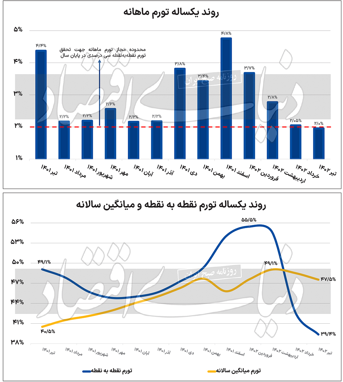 در بخش دیگری از گزارش تازه تورم تیرماه، نرخ تورم ماهانه بدون تغییر نسبت به خردادماه 2درصد ثبت شد. این دومین تایید حرکت تورم در کریدور تعیین شده است. اواسط خردادماه بود که رئیس کل بانک مرکزی در دیدار با رئیس صندوق بین‌المللی پول، از برنامه خود برای رساندن سطح تورم نقطه‌به‌نقطه سال 1402 به 30درصد پرده برداشت. فرزین که به عنوان رئیس کل بانک مرکزی ایران، برای اولین بار پس از چندین دهه با رئیس صندوق بین‌المللی پول دیدار می‌کرد، در این سفر از برنامه‌ها و اقدامات بانک مرکزی سخن گفت. «دنیای اقتصاد» در گزارشی با عنوان «حریم مجاز تورم ماهانه» اعلام کرد که وعده رساندن تورم به سطح 30درصد به این معناست که تا پایان اسفند 1402، نرخ تورم ماهانه از سطح 2درصد فراتر نرود. پس از خردادماه که تورم ماهانه 2درصد ثبت شد، در اولین ماه تابستان نیز نرخ تورم ماهانه از این سطح فراتر نرفت و با ثبت تورم 2درصدی برای دومین ماه پیاپی در محدوده مجاز باقی ماند.