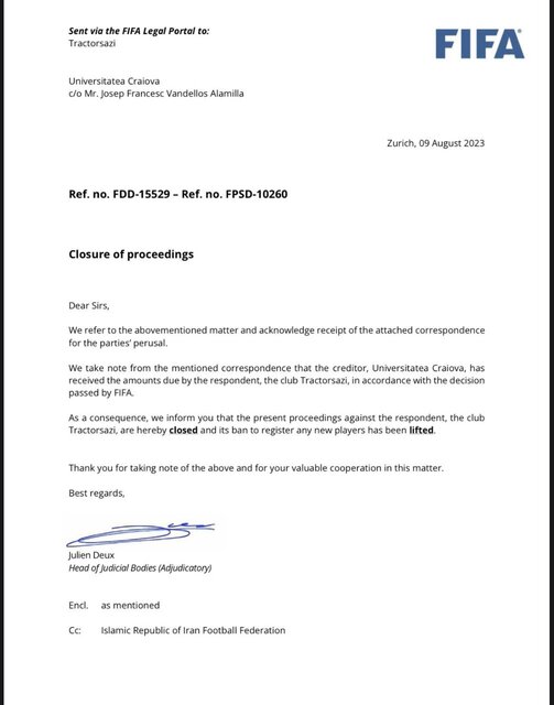 با این حال تراکتوریها پس از یک مرتبه که در واریز پول به حساب باشگاه رومانیایی ناکام مانده بودند، این واریز را تکرار کردند که در بار دوم موفقیت آمیز بود تا تاییدیه آن را به فیفا ارسال کنند.