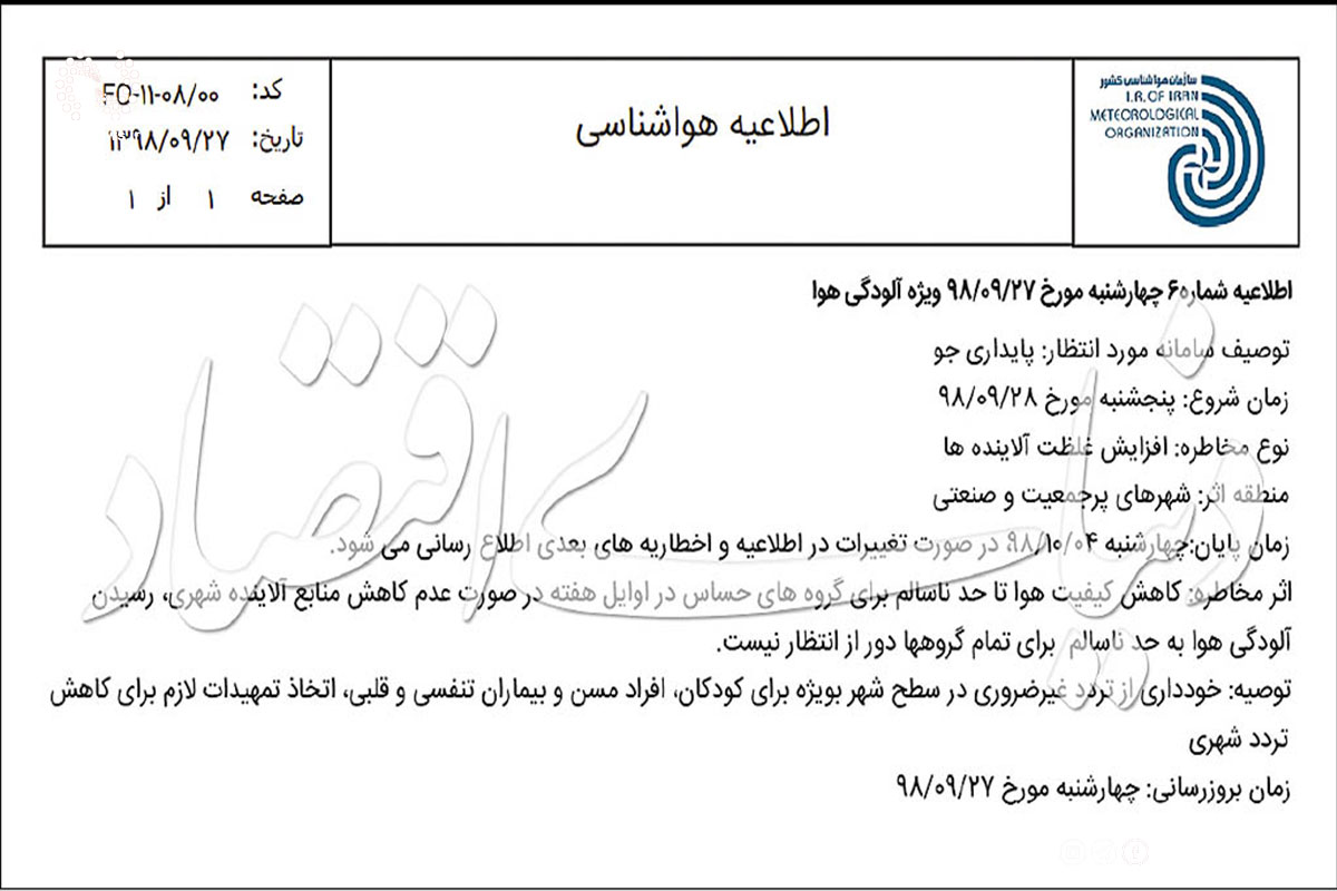 هشدار دوم توسط سازمان هواشناسی با اسم بردن از شهرهای پرجمعیت و صنعتی (که تهران شهر شاخص در این زمینه بهشمار میرود) منتشر شد. چهارشنبه گذشته در اطلاعیه سازمان هواشناسی اعلام شد، کیفیت هوا در شهرهای پرجمعیت و صنعتی به مدت یک هفته یعنی تا چهارشنبه چهارم دیماه در شرایط ناسالم قرار میگیرد و لازم است تدابیر لازم برای خودداری از تردد غیرضروری در سطح شهر به ویژه برای کودکان اتخاذ شود و همچنین برای کاهش رفت و آمد در شهر «تمهیدات لازم» در نظر گرفته شود.