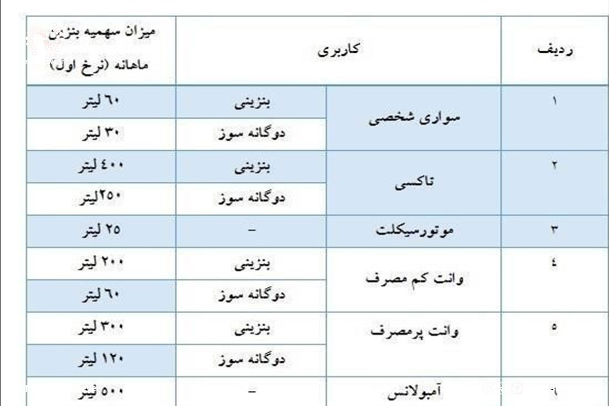بر این اساس، سهمیه خودروها و موتورسیکلتها طبق جدول زیر به کارتهای شخصی واریز شده است.