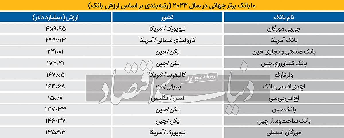 به گزارش نصر، تحلیلگران «فوربس» در روزهای پایانی ماه دسامبر بانک‌‌‌ها را از منظر عملکرد، مدیریت و همچنین ارزش آنها در سال 2023 رتبه‌‌‌بندی کردند. در نتیجه این آنالیز مشخص شد که از 10 بانک برتر جهانی، 4 بانک متعلق به ایالات‌متحده، 4 بانک متعلق به چین، یک بانک متعلق به هند و یک بانک هم متعلق به انگلیس است.